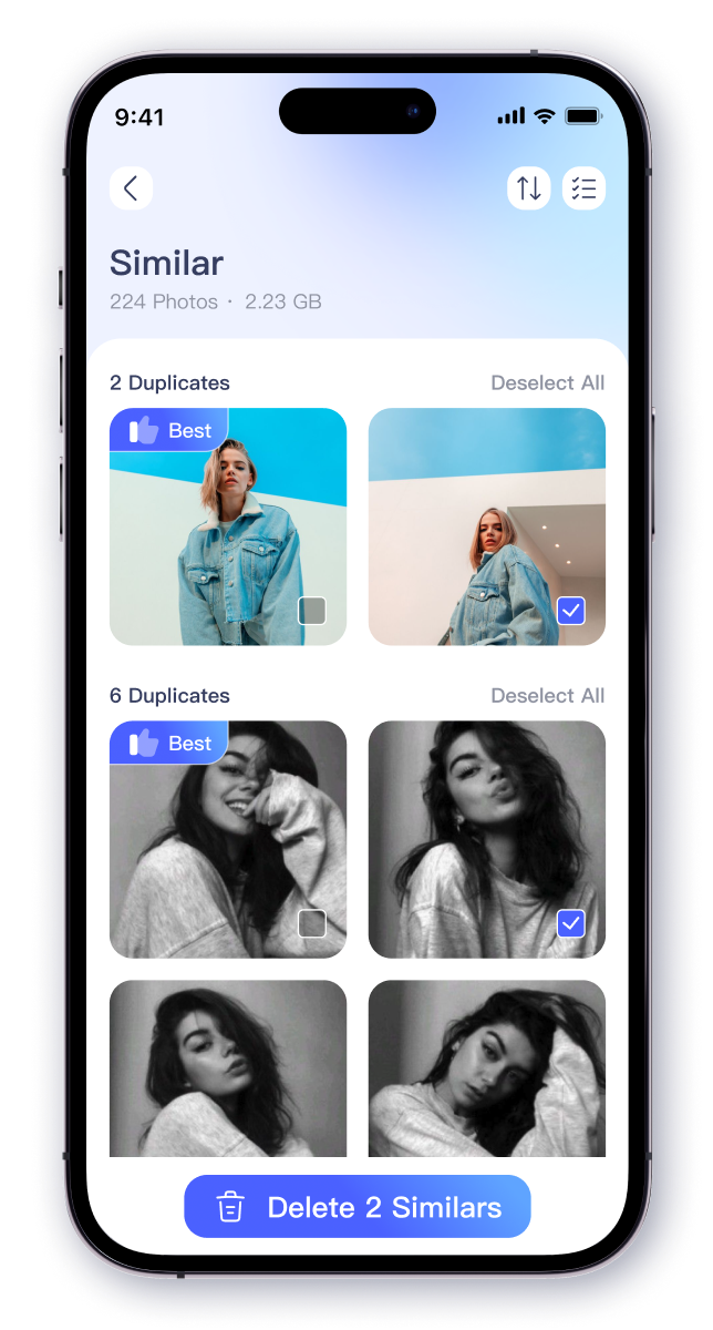 It automatically identifies similar and duplicate photos, and also provides organization of screenshots, text, and portrait photos.